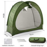 It is made of thick 210D silver-coated Oxford fabric and sturdy poles with tent pegs , it quickly assembles like a camping tent and provides covered storage for lawn mowers, grills, pool toys, and outdoor furniture.