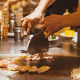The extended frying spatula makes it easy to shovel larger steaks. The Z-shaped design keeps hands away from the iron plate to avoid scalding.