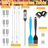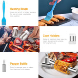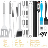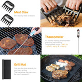 • 25 PCS BBQ Tools Set: Package include 1 * meat thermometer, 1 * BBQ tongs, 1 * BBQ spatula, 1 * BBQ fork (long), 1 * grill mat, 1 * brush, 4 * kabob skewers, 8 * corn holders , 2 * spice bottles, 1 * gloves, 2 * meat claws, 2 * Oil brush and 1 * storage bag. Everything can be packed in the storage bag, easy and convenient.